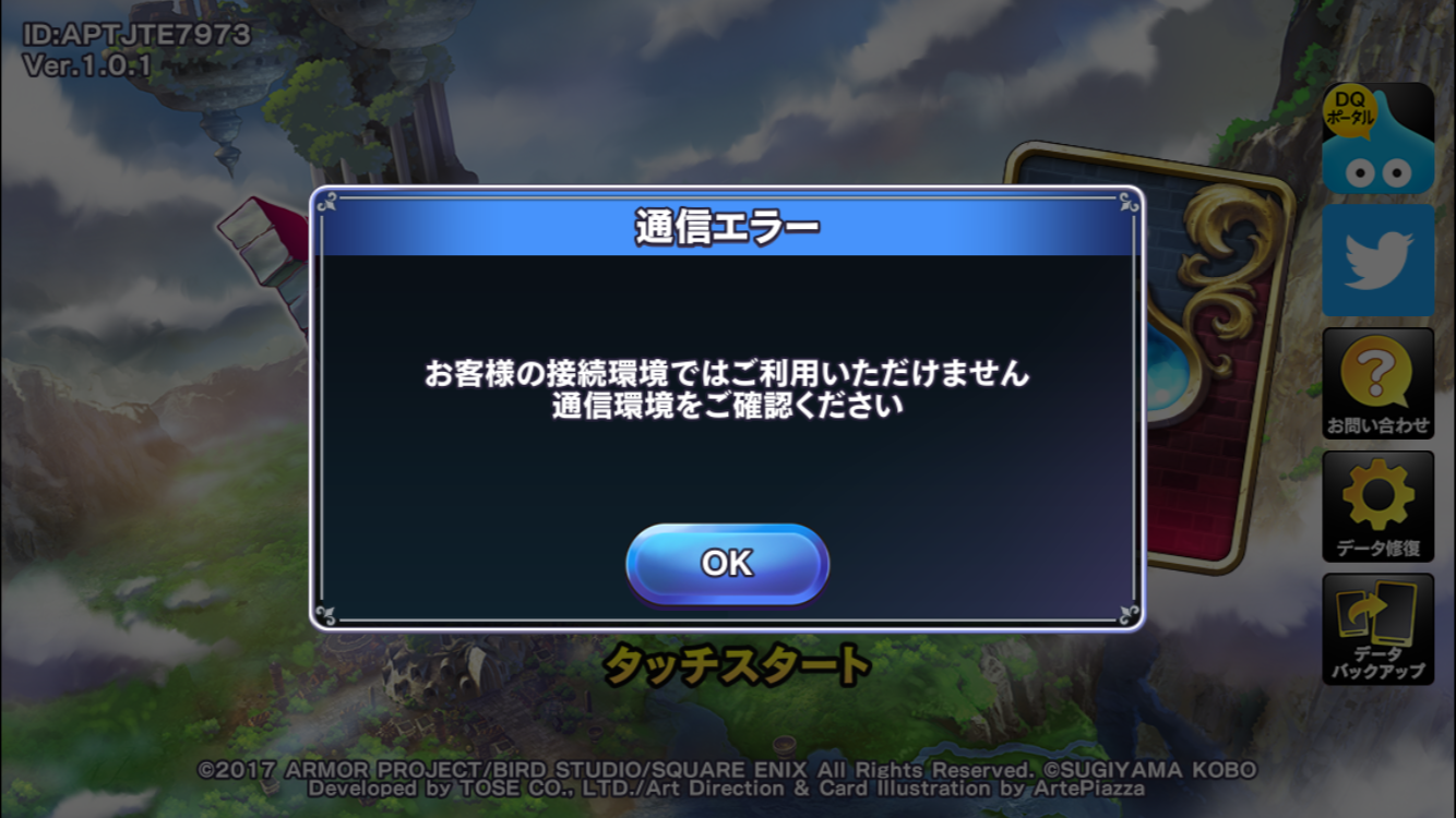 先日、ドラゴンクエストライバルズがローンチされまして、暇だし遊ぼうかな~と思っていたところ、通信できない!?!?とのこと。